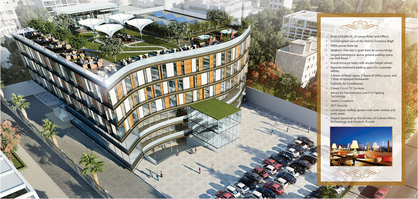 The appetite for luxurious commercial space is on the rise. The city of Amritsar, with a large diaspora of NRIs, globetrotters and discerning Amritsar residents, needs a place that promises an international outlook with sophistication. Mukut House aims to fit these needs. Designed by renowned architects, developed by people with a reputation for quality and excellence. Located in the heart city, Mukut House is envisioned to be Amritsar's most distinguished landmark. Mukut House covers an area over 200,000 sft. It will be a luxury mixed -use project consisting of offices, high street retail, banqueting and restaurant.